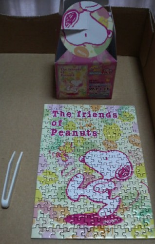 で、ジグソーパズルも沢山売っていたわけですが、やりがいがあって高くない可愛い柄のを選んだ結果、写真のような204ピース380円ピンセット付きスヌー○ーのものにしました。他にもいろいろあって、勿論大きなものもありましたが、やはり高いですね。2000円とかしちゃうものね。少し大きめのめっさ欲しい柄のがあったのですが、1030円なので諦めました。衝動買いで1000円は超えちゃ駄目よねぇ…(私の中で)。